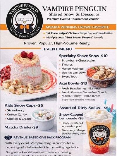 Bring the magic of Vampire Penguin to your next event! Our fully wrapped and licensed food trailer is perfect for school celebrations, staff appreciation days, festivals, birthdays, sporting tournaments / celebrations, and more. We serve handcrafted shaved snow desserts, refreshing smoothies, and açai or yogurt bowls—all made fresh and served with fast, friendly service. Packages start at just $5 per person, and we’re fully self-contained with a clean, quiet generator—no hookups needed. Whether you're serving 100 guests or 500+, we’ll customize a plan to keep the crowd cool, happy, and coming back for more. Fill out the form below to get started—we’d love to be part of your celebration!